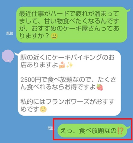 ここでは好きな人を「ケーキが好きな女性」と仮定して、ケーキに関係する質問をしてみます。