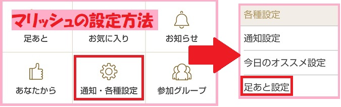 どちらもマイページの「各種設定」→「足あと設定」でオフにでき、操作自体は難しくありませんが、マリッシュで足あとをオフに設定する場合は、月額会員への登録が必要です。