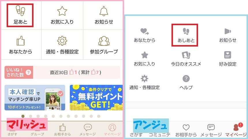 足あとを確認する方法は簡単で、マリッシュとアンジュどちらもマイページから確認できます。