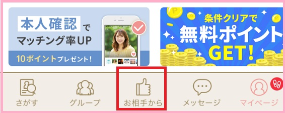 相手から届いた「いいね」はメイン画面の「お相手から」で確認できますが、あまり多くの「いいね」が届くと、過去の「いいね」が埋もれてしまいます。