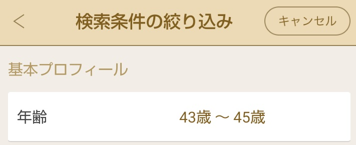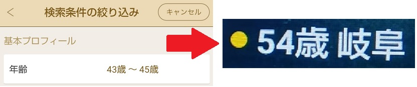 例えば画像の条件を設定すれば表示される相手は「43~45歳」に限定されますが、「あなたを気になってる人がいます」では、この年齢に当てはまらない相手も表示されます。