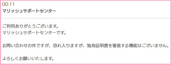 このような回答が届いた以上、「マリッシュで独身証明書の審査は行っていない」と断言できます。