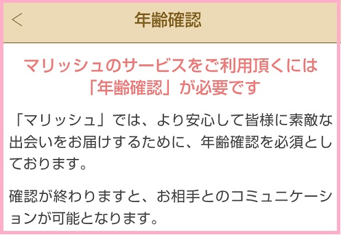 マリッシュは年齢確認・本人確認が別途となっているのが特徴で、年齢確認はマリッシュの機能を利用するために必須です。