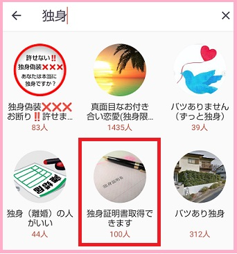 アンジュではマリッシュのグループに相当するコミュニティが機能として搭載されていますが、「独身証明書」をテーマとしたコミュニティも確認できます。
