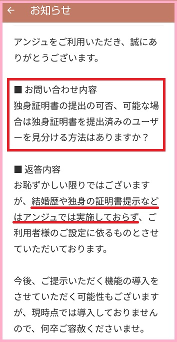 これが運営からの回答であり、現時点という前提で「独身証明書の提示などはアンジュでは実施していない」と明言されています。