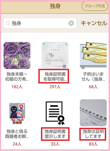 • 「独身証明書の提示」をテーマとしたグループを作成する